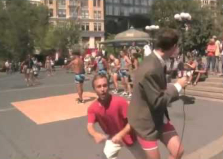 Dieser Reporter berichtete live aus dem immer vollen Washington Square Park, als ein Störenfried ihn plötzlich von hinten überraschte und seine Hose herunterzog, wodurch sein pinkfarbener Unterwäsche zu sehen war. Zum Glück trug der Reporter an diesem Tag etwas!