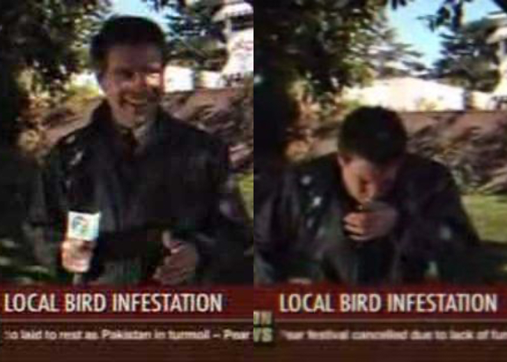 Reporter versuchen, so nah wie möglich an die Quelle der Nachrichten zu gelangen, um die besten Infos zu bekommen. Doch dieser Reporter bekam mehr, als er erwartet hatte, als er über eine Stadt berichtete, die von einer Vogelplage heimgesucht wurde. Während er in die Kamera schaute, hätte er wohl auch nach oben schauen sollen, bevor er sich seinen Standort aussuchte. Zuerst landete ein Vogelschiss auf seiner Schulter, und als er nach oben schaute, traf es ihn im Mund. Und das alles sahen wir!