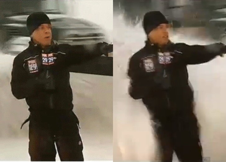 In der eisigen Kälte trug der Wettermoderator passende Kleidung, war jedoch auf den kommenden Schneesturm nicht vorbereitet. Gerade als er zu sprechen begann, passierte ein Schneepflug, der ihn komplett mit Schnee bedeckte, während die anderen rechtzeitig auswichen!